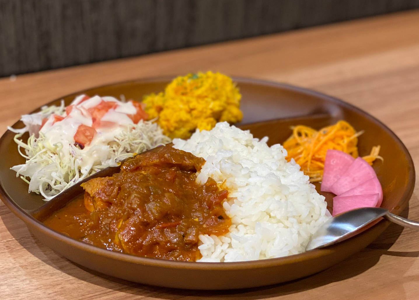 (スパイスカレー、2種のサラダ、にんじんのラペ、お漬物)